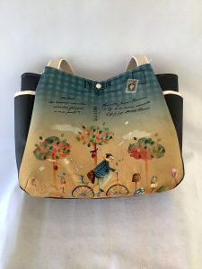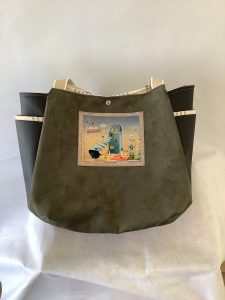Cabas grand volume avec un magnifique coupon velours de l’atelier de Noémie. HAuteur 36 largeur 44 profondeur 16