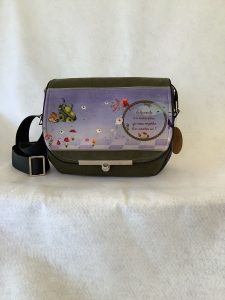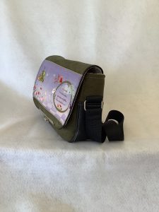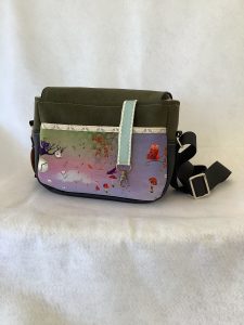 Sac besace avec rabat.. Bandoulière réglable. Poche Extérieur avec son porte-clés. Une à deux poches intérieur. Magnifique coupon velours de l’atelier de Noémie. Taille largeur 23 hauteur 16 profondeur 8 cm